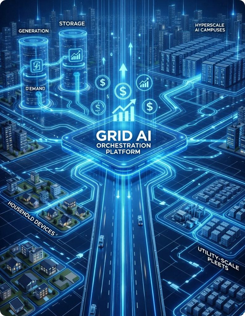 By dynamically orchestrating generation, storage, and demand across households, businesses, utilities, and hyperscale AI campuses, Grid AI enables energy systems to respond instantly to changing conditions without compromising reliability.